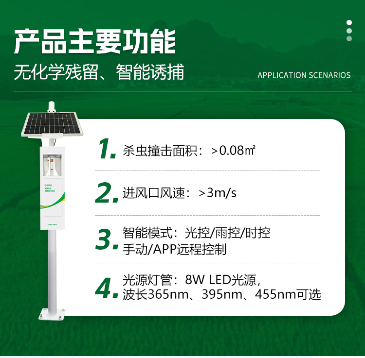 风吸式杀虫灯是一种新型的环保杀虫设备,结合了传统杀虫灯和现代科技,是利用诱虫光源吸引昆虫并通过设备机制捕获或消灭它们的杀虫设备,可实现大小虫子通杀,有效控制虫害,有助于提高病虫害绿色防控水平。可广泛应用于农业、林业、牧业、蔬菜、烟草、茶叶、药材、园林、果园、城镇绿化、检疫等领域。