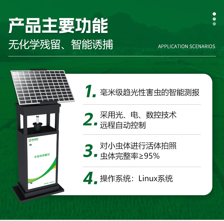 小虫体测报仪是一款专用于诱集和测报毫米级趋光性害虫的智能测报工具。在无人监管的情况下,可自动完成对小虫体的诱虫、拍照、收集等系统作业,同时将虫害数据上传到网络服务器,服务器后台根据上传的图片进行虫子种类及数量的识别与确认。