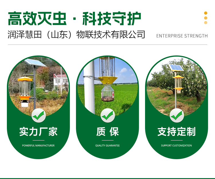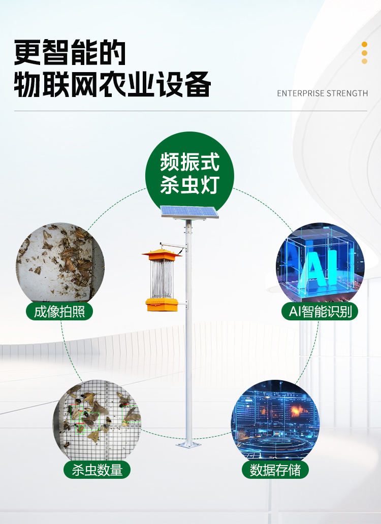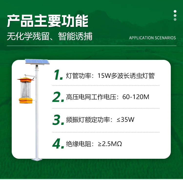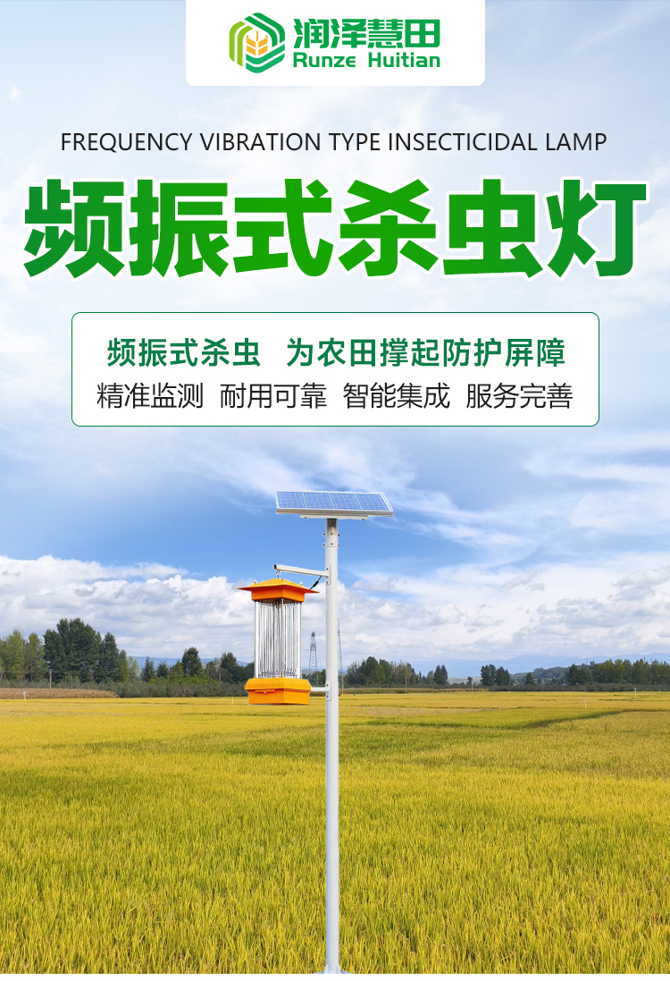 频振式杀虫灯 又称太阳能杀虫灯、物联网杀虫灯,利用害虫有较强的趋光、趋波、趋色、趋性的特性,选用对害虫有较强的诱集光源,引诱害虫扑灯并配用频振式高压瞬间触杀式杀虫。该产品诱杀害虫数量大、较大幅度降低了害虫密度,杜绝害虫繁殖。对人畜无毒无害,减少对环境污染,维护生态平衡。可广泛用于农业、林业、蔬菜园、果园、草原、茶园、烟草、棉花种植、城市绿化、水产养殖等领域。