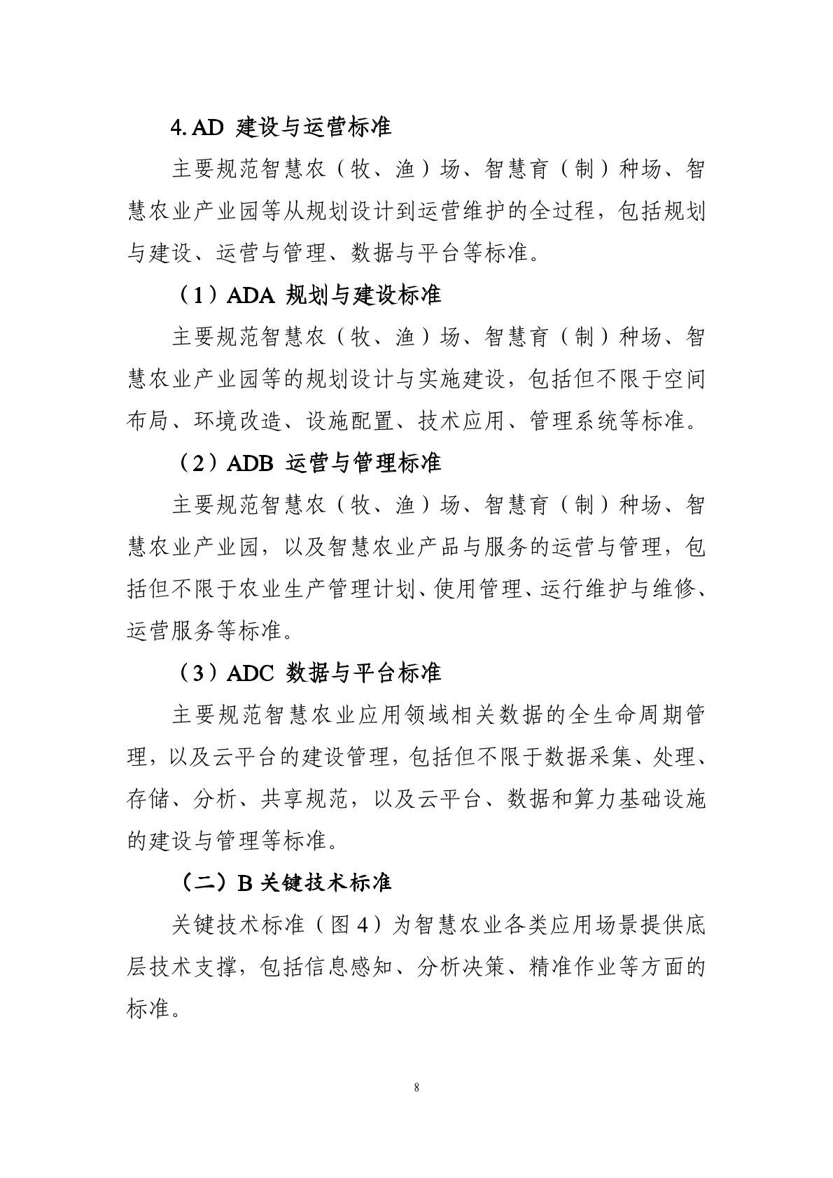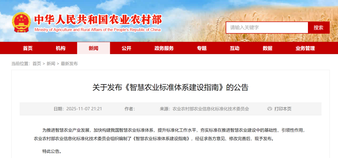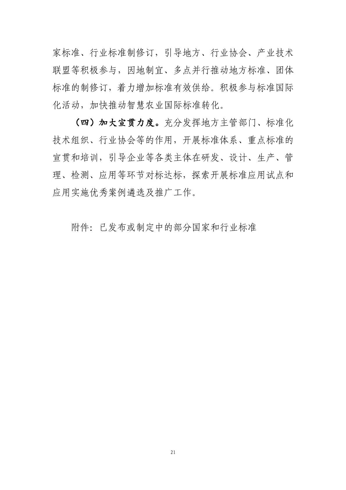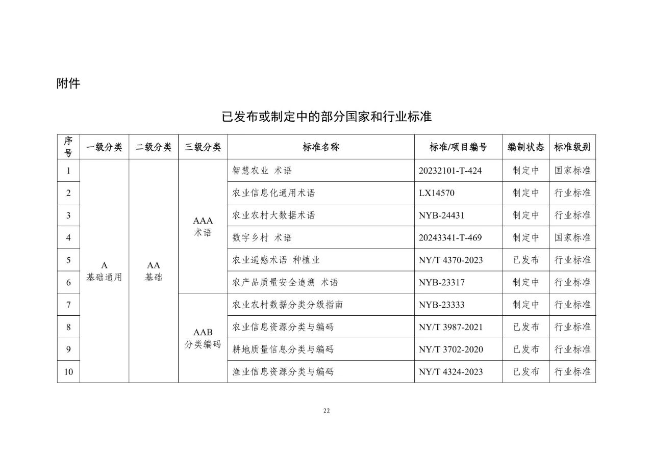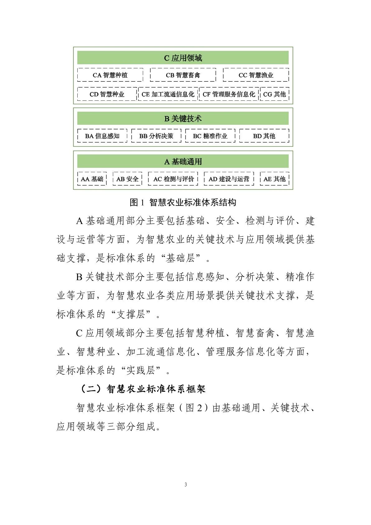 为推进智慧农业产业发展,加快构建我国智慧农业标准体系,提升标准化工作水平,夯实标准在推进智慧农业建设中的基础性、引领性作用,农业农村部农业信息化标准化技术委员会组织编制了《智慧农业标准体系建设指南》,经征求各方意见、修改完善后,现予发布。