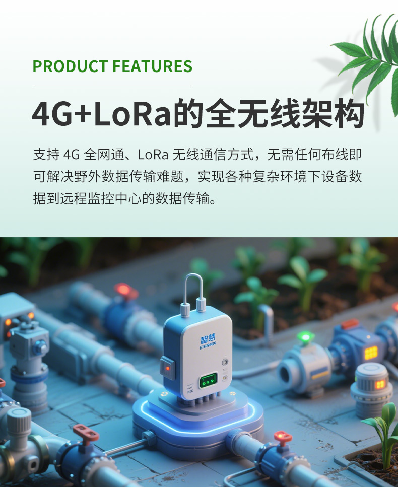 LoRa无线智能网关采用工业级专用网络处理器及高速4G无线通讯模块设计,支持GPS高精度时钟同步,拥有多频点、多信道的并发处理能力,能够满足工业现场复杂的大容量组网需求。其主要应用于智慧灌溉、水资源监测、智能温室、农情监测等场景。